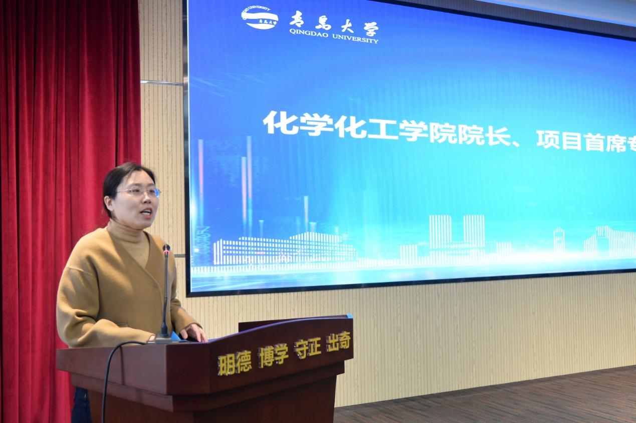 仪式上,项目首席专家、青岛大学化学化工学院院长毕赛介绍了项目整体实施方案。本次培训以“数智赋能 创新实践”为主题,构建“价值引领-专业深耕-技术赋能-成果产出” 闭环培养体系,围绕“卓越教师”的核心素养提升,设置了师德修养与专业情怀、学科理解与学术前沿、课堂教学与实验创新、竞赛指导与拔尖培养、教学研究与成果培育、智能教育与技术赋能等六大课程模块,分两年完成培训目标。项目组建了 “教师教育专家-高校学科专家-人工智能专家-一线实践专家”四位一体的高水平师资团队,汇聚来自山东师范大学、华东师范大学等省内外高校知名学者,以及山东省教科院、青岛市教科院等单位的国家 “万人计划” 教学名师、正高级教师等一线专家,采用专题讲座、跟岗研学、案例研讨等线上线下混合模式,推动理论研修与实践提升深度融合。为保障培训质量,青岛大学建立了校级领导小组、项目管理办公室、执行工作小组三级管理架构,实施 “双班主任制”与全过程精细化管理,构建 “智能化、全过程、双闭环” 质量保障体系,依托虚拟仿真教学实验室、云教学平台等数字化资源,实现培训数据实时采集、学情动态分析。